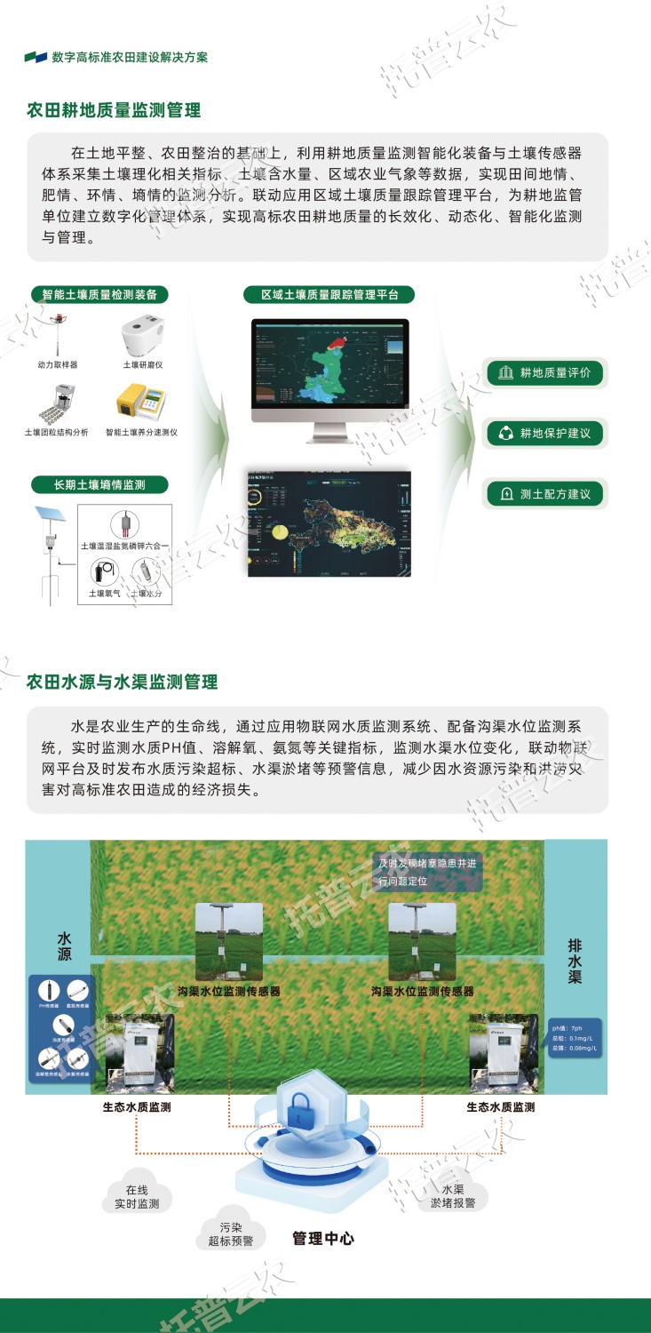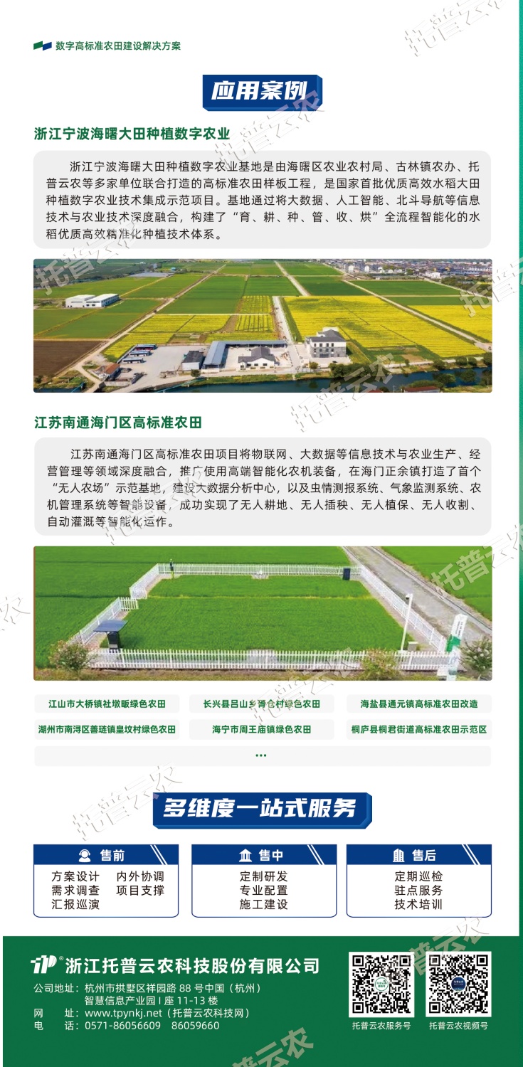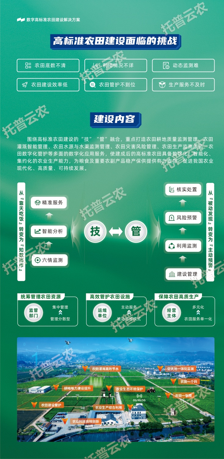 作为中国智慧农业领域的先行者,浙江托普云农科技股份有限公司(股票简称:托普云农,股票代码:301556)始终立于行业一线,深入探索数智技术与农业生产的融合应用,以高标准农田建设的“技”“管”融合为理念,以关键智能化场景打造为抓手,构建数字化、智能化、集约化的高标准农田(绿色农田)建设解决方案。