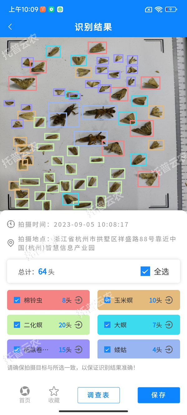 3. 识别虫类:当前虫库包括以下种类的成虫——草地贪夜蛾、草地螟、稻纵卷叶螟、二化螟、玉米螟、斜纹夜蛾、甜菜夜蛾、小地老虎、八字地老虎、大地老虎、棉铃虫、二点委夜蛾、大螟、可在虫库中任意选择5种。