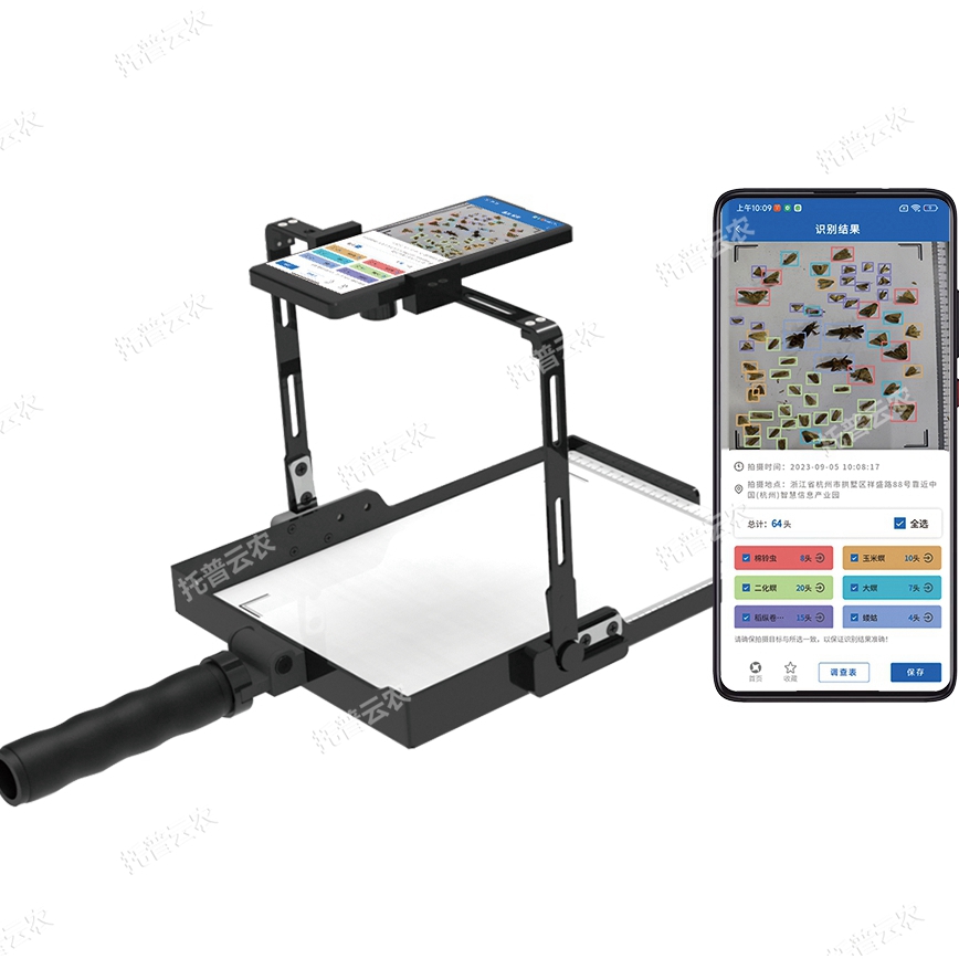 便携式害虫采集识别系统是一款适用于植保测报人员的田间害虫调查设备,搭载人工智能图像识别模型和配套小工具,配合专用App使害虫种类和数量可视化呈现在用户面前,可搭配不具识别功能的测报灯、杀虫灯使用,解决其无法识别计数的痛点。