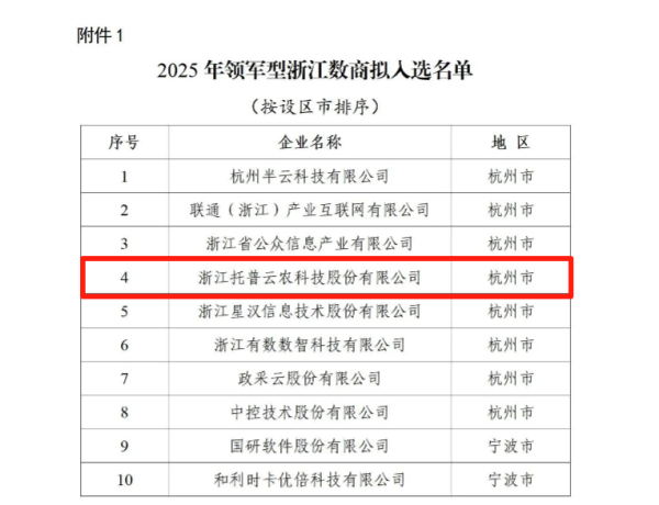 近日,浙江省经济和信息化厅公布《关于2025年浙江数商入选名单(领军型、成长型)》,浙江托普云农科技股份有限公司(股票简称:托普云农,股票代码:301556)凭借在智慧农业大数据领域的持续创新与实践成果,成功入选!